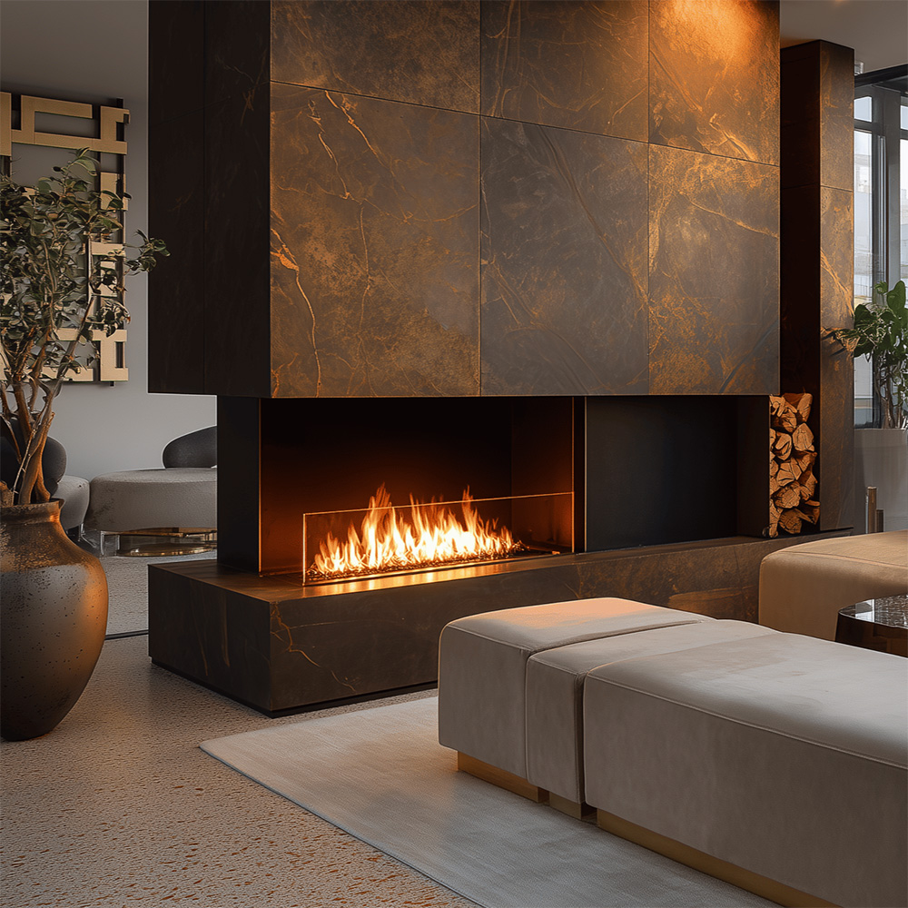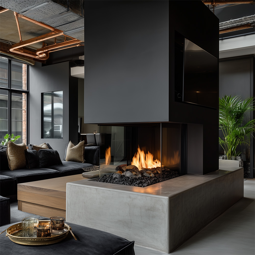 Panoramic flames and contemporary design, allowing you to enjoy the fire from several perspectives in the room.